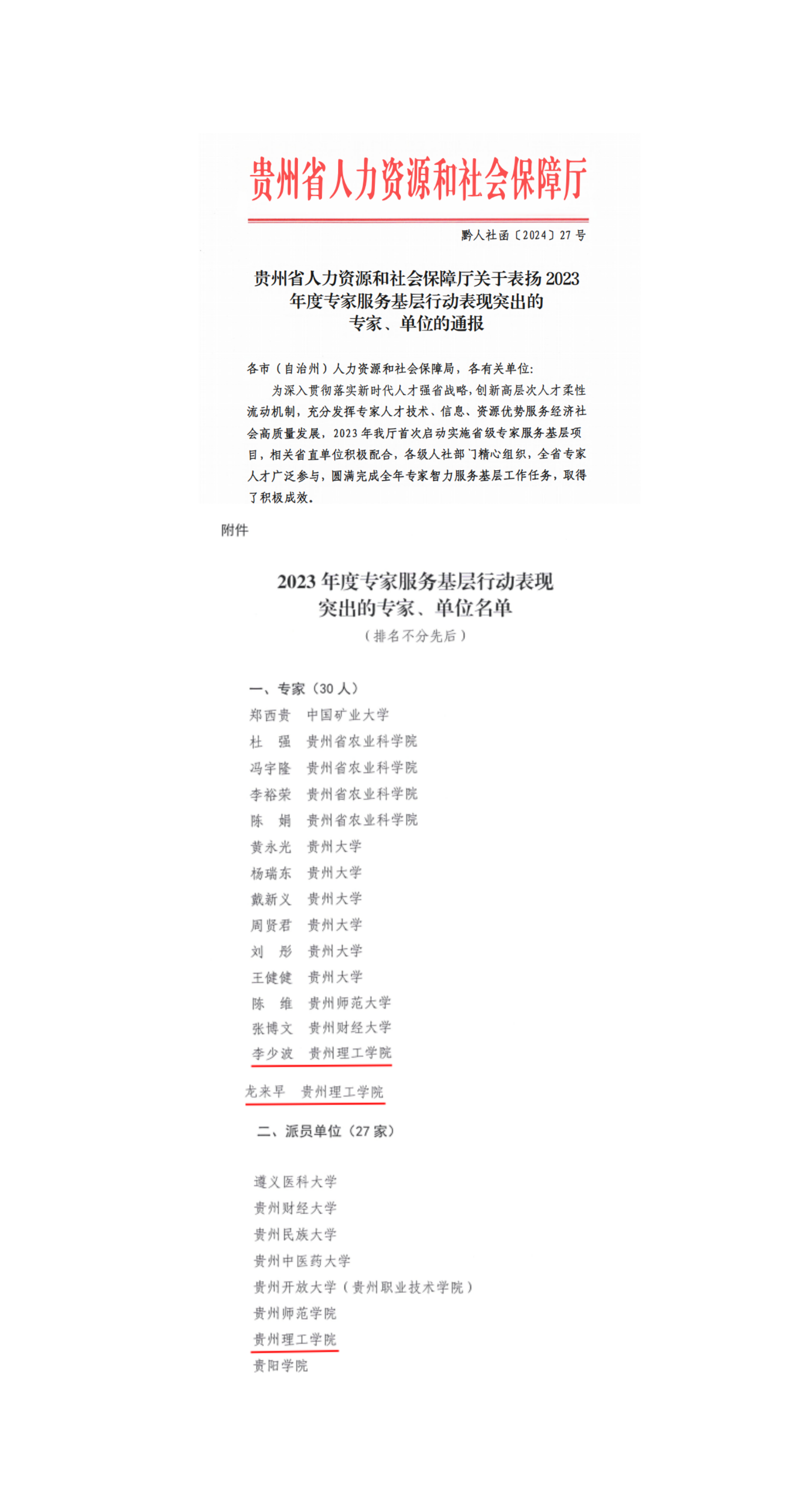 近日,贵州省人力资源和社会保障厅发布《关于表扬2023年度专家服务基层行动表现突出的专家、单位的通报》(黔人社函[2024]27号),开元官网荣获2023年度专家服务基层行动表现突出单位,李少波、龙来早两位科研人员荣获2023年度“贵州省专家服务基层行动表现突出专家”荣誉称号