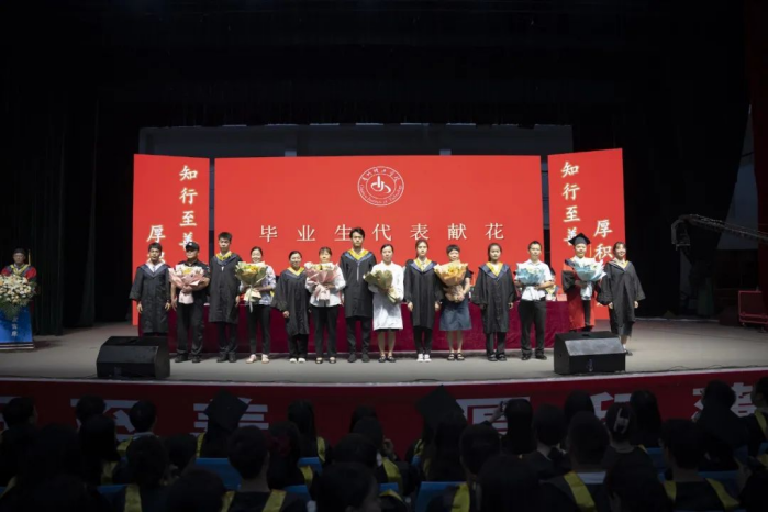 毕业生代表向教师代表、毕业班辅导员班主任、后勤管理处工作人员、图书馆工作人员、物业管理人员、保卫人员、食堂工作人员代表献花。