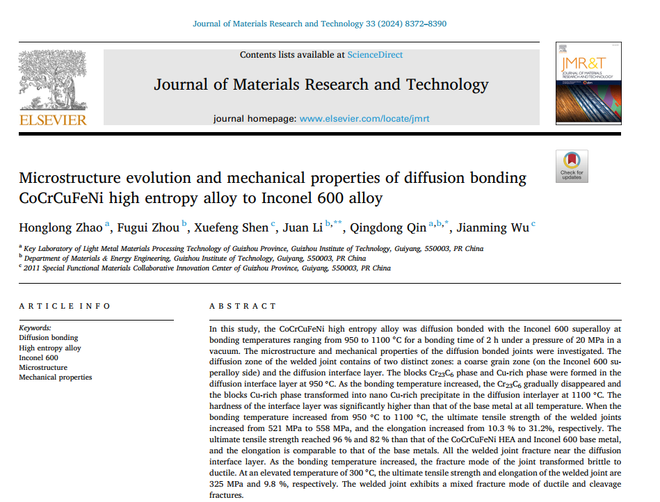 KY开元集团官网分析测试中心老师赵宏龙为第一作者,材料与能源工程学院李娟副教授、秦庆东教授分别为通讯作者,在国际知名学术期刊《Journal of Materials Research and Technology》(JCR1区,影响因子IF=6.2)上发表题为《Microstructure evolution and mechanical properties of diffusion bonding CoCrCuFeNi high entropy alloy to Inconel 600 alloy》研究论文,并被Web of Science数据库检索。