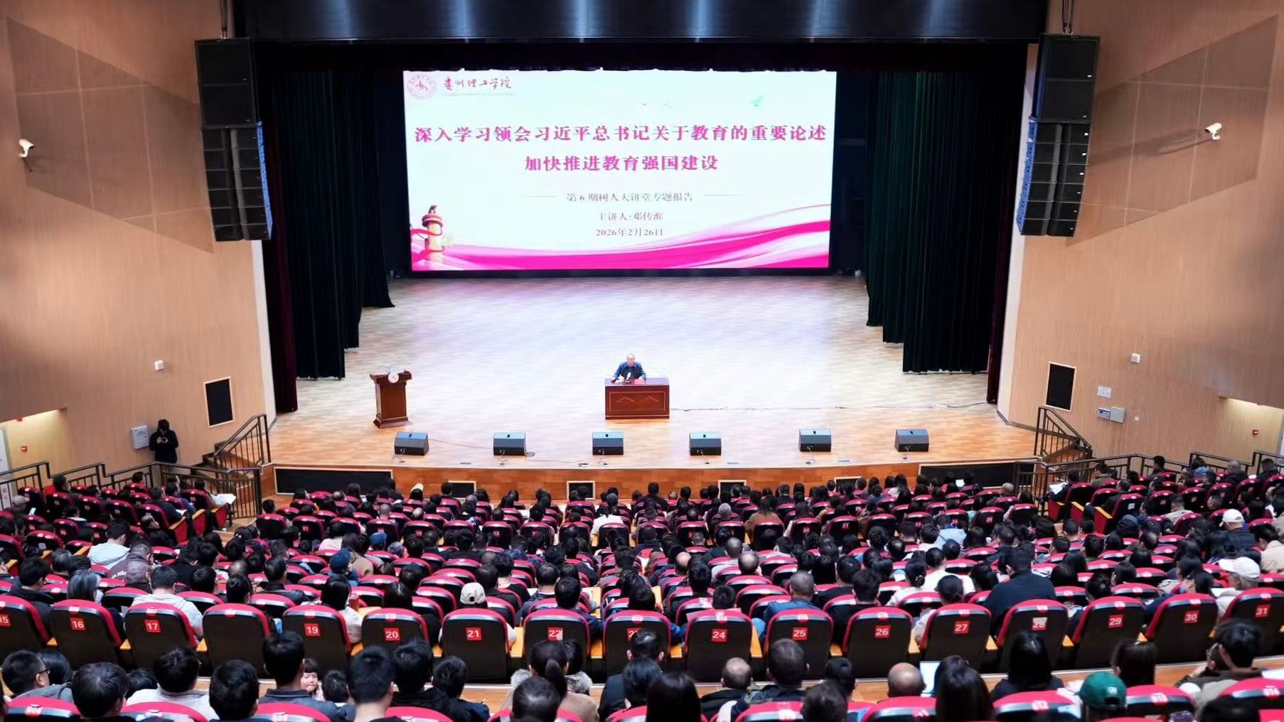 2月26日上午,KY开元集团官网第六期“树人大讲堂”在蕴华楼大礼堂举行。中国教育学会学术委员会常务副主任委员邓传淮,贵州大学副校长、中国高等教育学会常务理事向嵩应邀作专题报告。全体校领导、教职工及部分学生代表参加,校党委书记张大林主持。