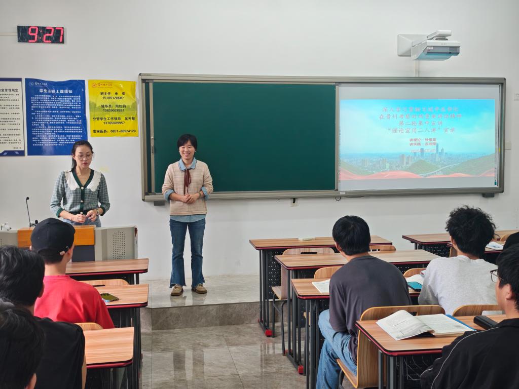 宣讲过程中,钟银星老师围绕习近平总书记考察贵州所蕴含的重大政治意义、实践意义与深远历史意义展开,解读习近平总书记重要讲话的丰富内涵、精神实质与实践要求,助力同学们夯实理论基础,在学思践悟中筑牢信仰之基。苏利荣老师则从实践角度,讲述在习近平总书记重要讲话精神指引下,贵州在经济发展、民生改善、社会建设等多领域取得的斐然成就,以鲜活案例激励同学们坚定理想信念,胸怀家国天下,将个人成长与国家发展紧密相连。